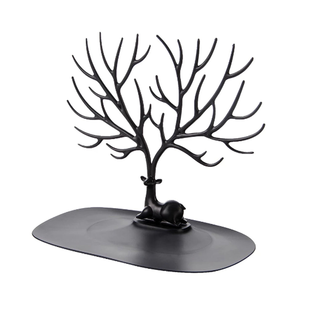 Make this beautiful deer design jewelry stand a centerpiece of your vanity or bathroom counter. The lovely design adds a touch of classic beauty to your space, while the deer's antlers form branches can provide you with a place to display, store, and organize your necklaces, bracelets, rings. You can also use the oval shaped tray at the bottom of this jewelry holder to store more rings, bracelets, necklaces, baubles, and other items.